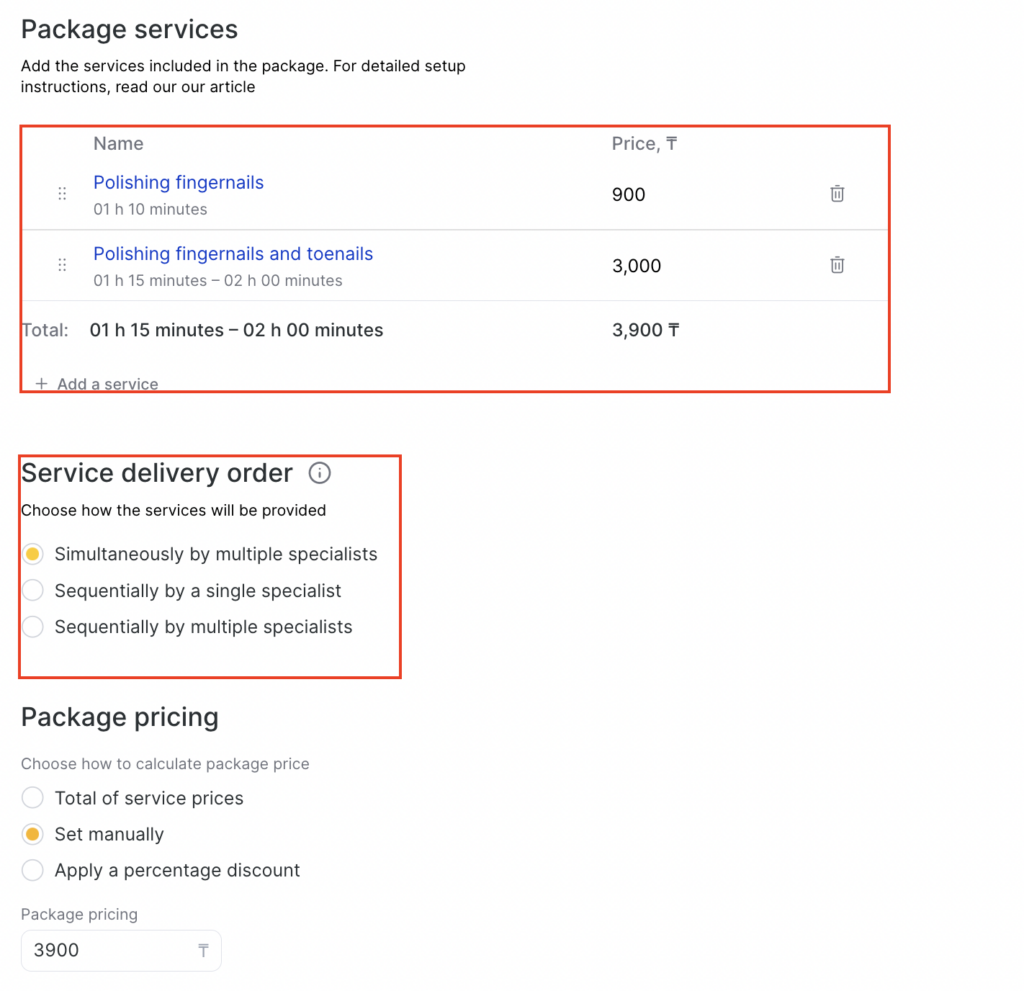 - Polishing fingernails + Manicure + Sellac: a sequential package, performed by one team member (or several). In this case, you can set a price for the entire package at once, for example with a discount — this discount will be visible to clients in online booking.