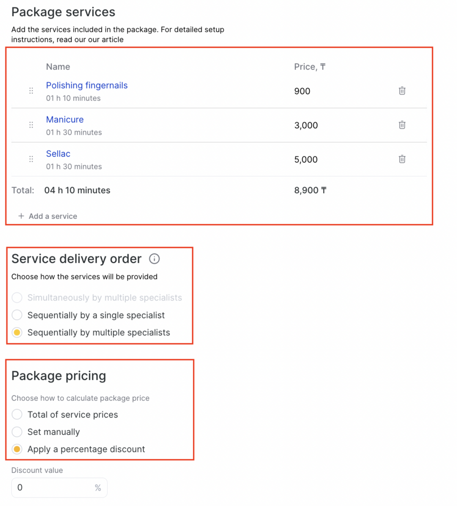 - Apply percentage discount — you can set a discount percentage for the package. The discount percentage will be applied to each service. The resulting service prices are rounded to whole numbers.