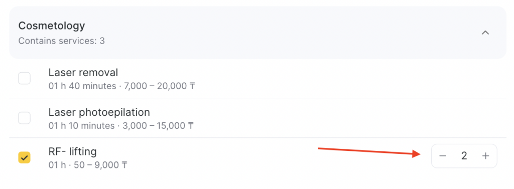 5. You can select the same service multiple times and set the quantity using the “+” and “–” buttons.