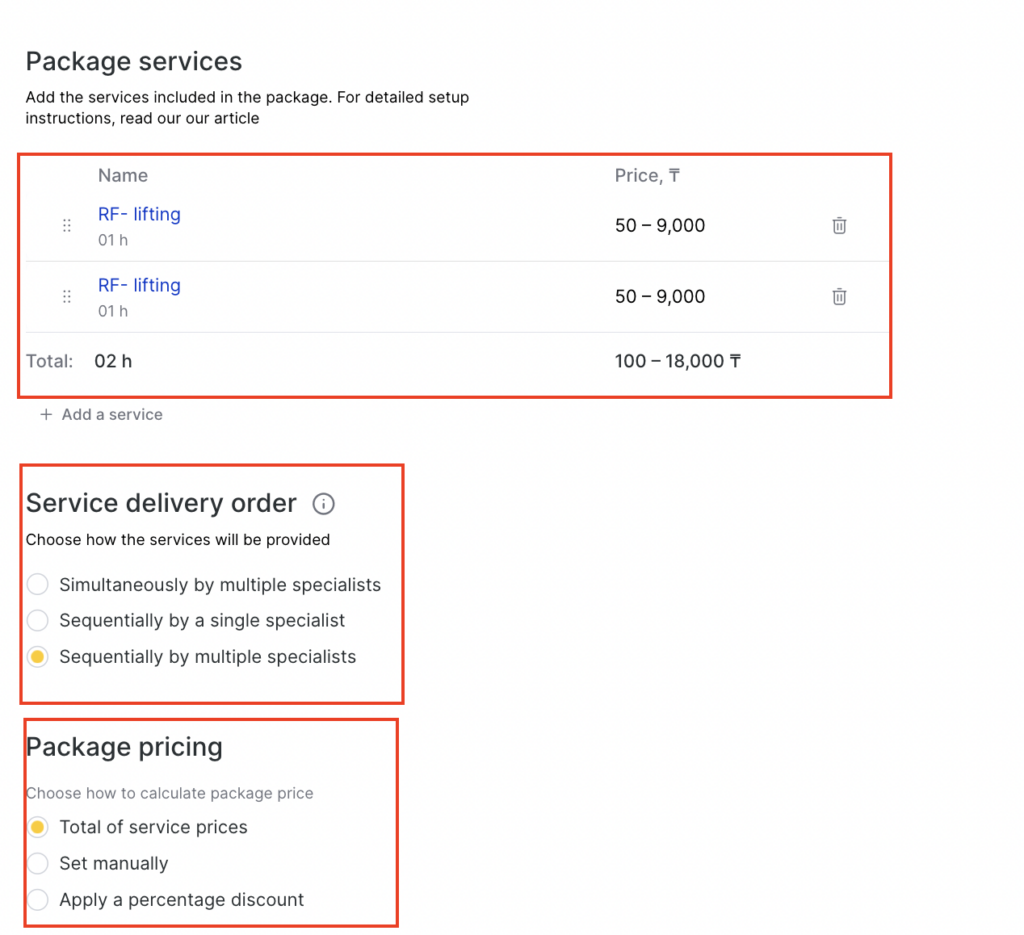 - Select the services included in the package, their order of delivery, and specify the package price.