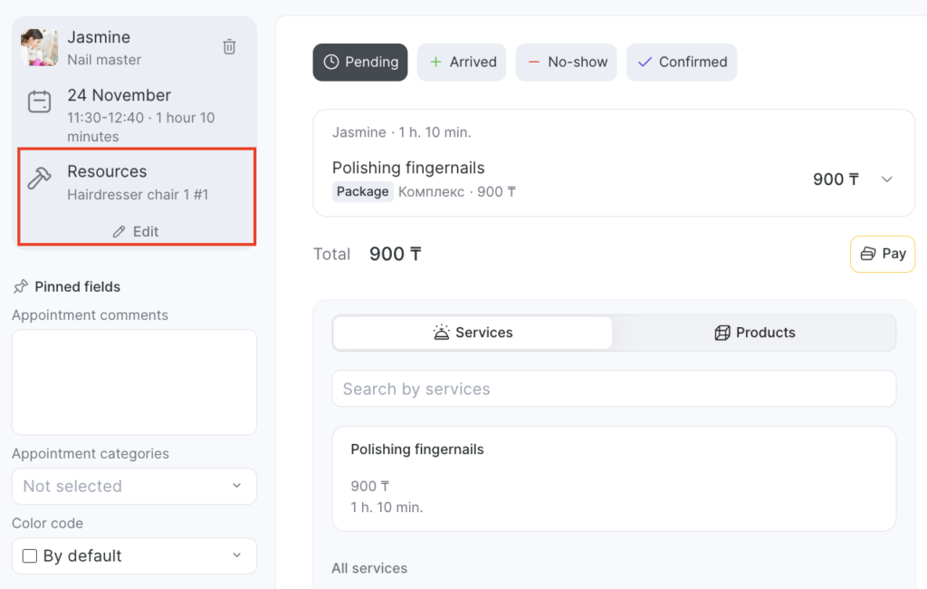 - If you use resources, you can also work with them in packages — create bookings via the Resources menu in the appointment calendar and add resources in the visit window.