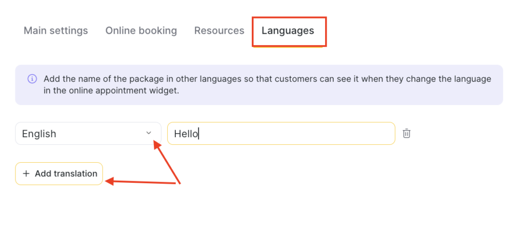 Specify the package name in other languages so that clients see it when they change the language in the online booking widget.