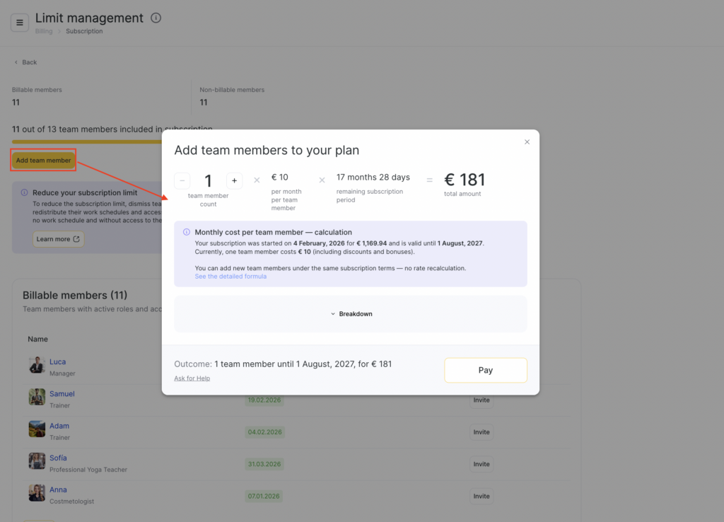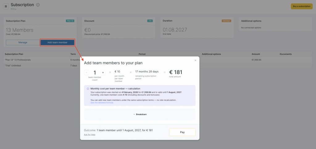 The price for an additional team member is automatically calculated based on the latest purchased subscription only — without taking into account any previous subscriptions or their bonus months.