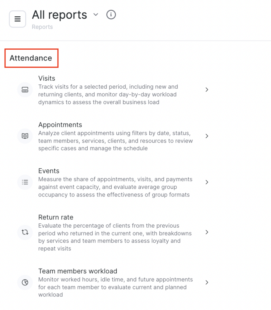 - Visits — track visits for a selected period, including new and returning clients, and monitor day-by-day workload dynamics to assess the overall business load. Get more information about this report in this article.