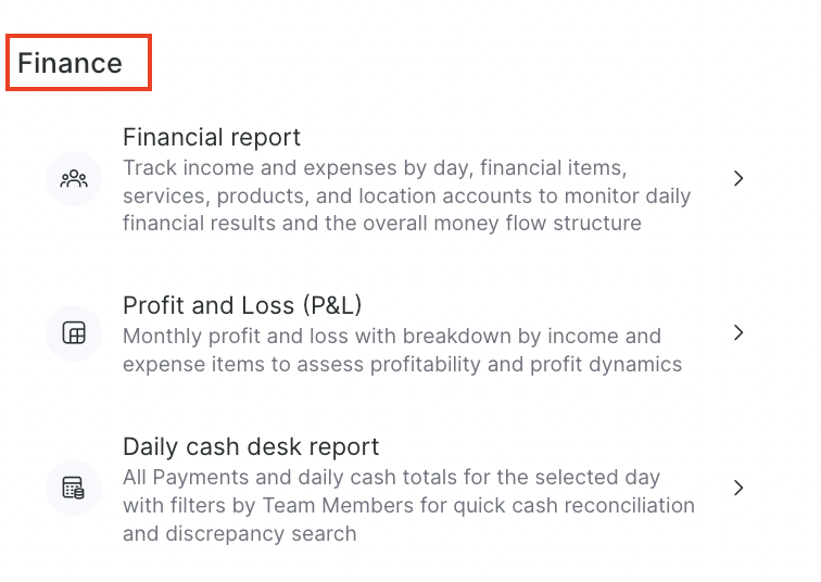 - Financial report — view income and expenses with breakdown by day, categories, services, products, and cash registers. Read more about this report in the article.