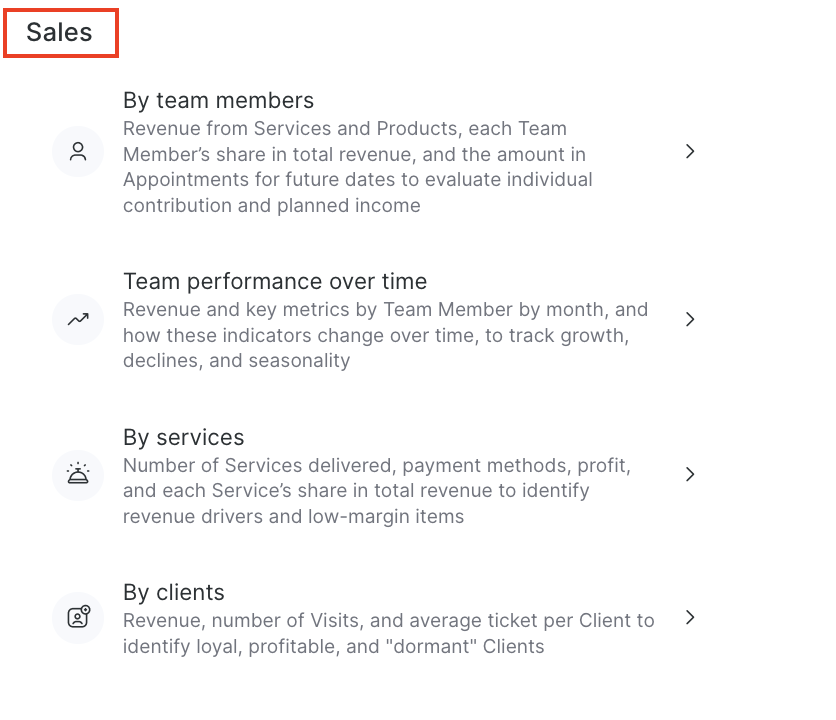 - By clients — client behavior by revenue, visits, and average ticket size. Read in detail about this type of report in this article.