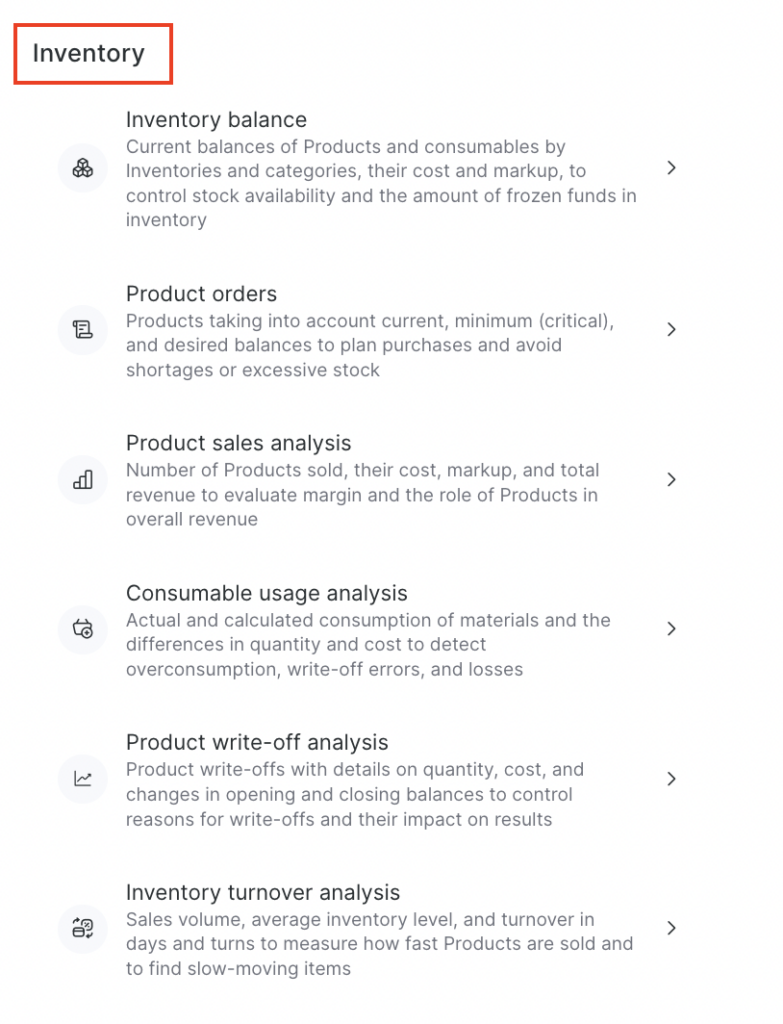 - Product write-off analysis — check product write-offs and their impact on inventory balances. Read about this report in detail in this guide.