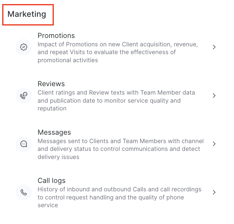 - Promotions — see how promotions attract clients and affect repeat visits and revenue. Get more information about this report in this article.