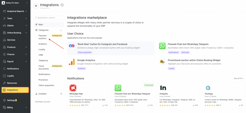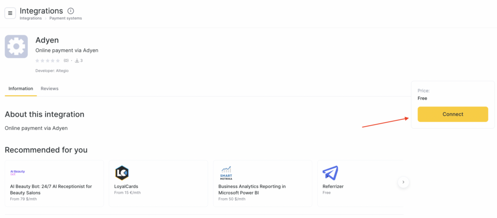 Adyen is available as a payment system inside Altegio, so eligible companies can accept online payments and receive payouts to a business bank account.