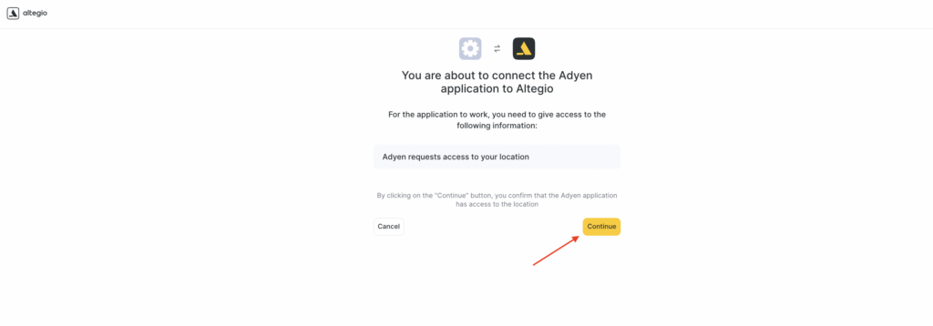 - You will see a confirmation screen saying you’re about to connect the Adyen application to Altegio and that it requests access to your location.