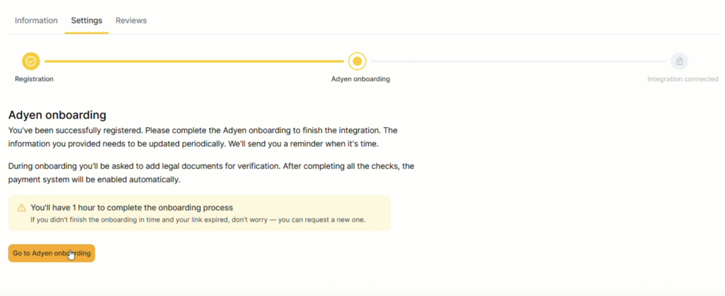 If the link expires, you can request/generate a new link from the same integration screen (Altegio will provide a way to return to onboarding).Click Go to Adyen onboarding to open the hosted onboarding flow.