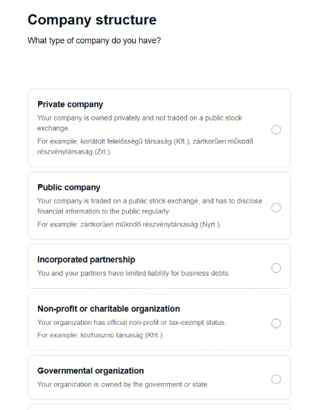 - Company structure (e.g., private company / public company / non-profit, etc.)