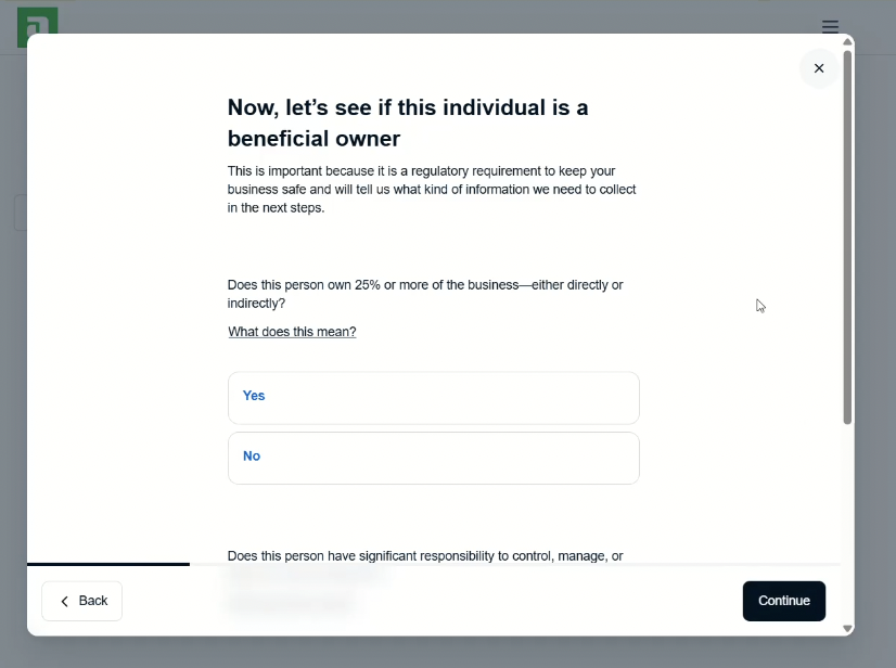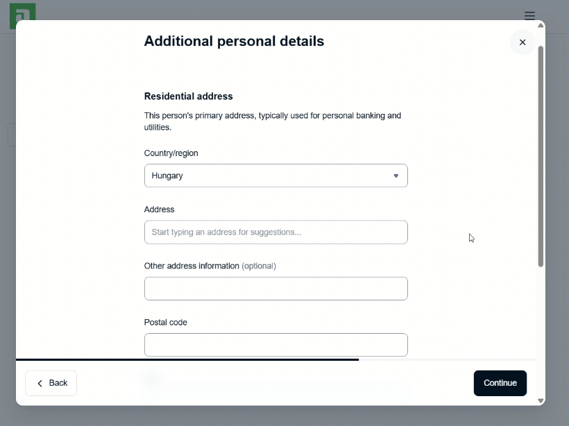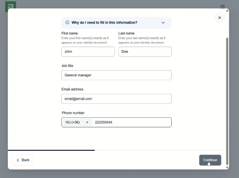 - Legal business details (legal name, registration country, business address, phone, etc.).