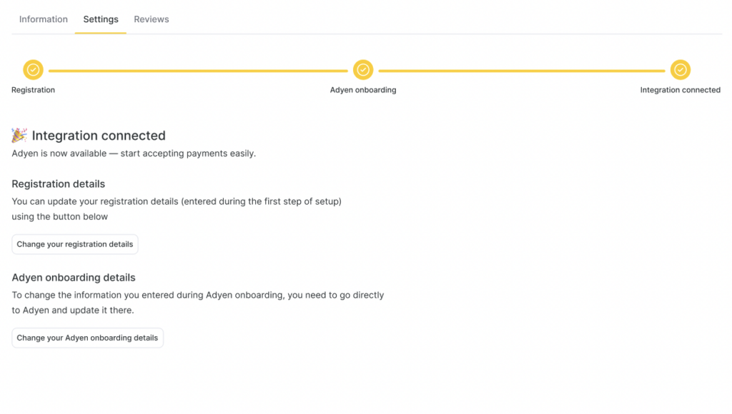 - Change your Adyen onboarding details (this sends you back to Adyen to update verified info)