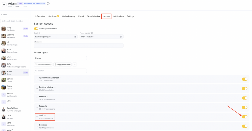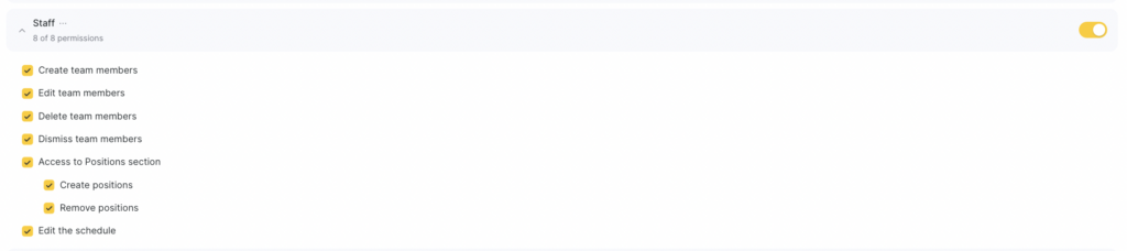In the Staff access rights section, you can control which actions a user is allowed to perform when working with team members, positions, and schedules.