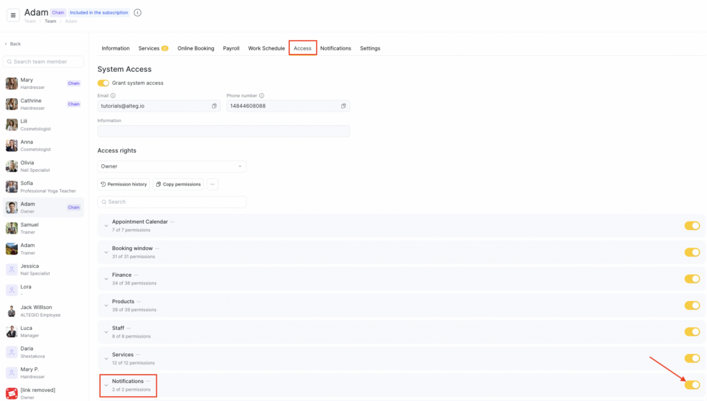 In the Notifications permissions section, you can control whether a user has access to notification settings in the system.