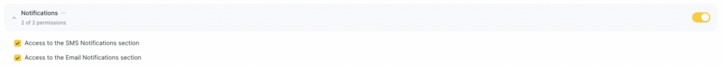 These permissions determine whether a role can open and manage SMS and email notification sections.