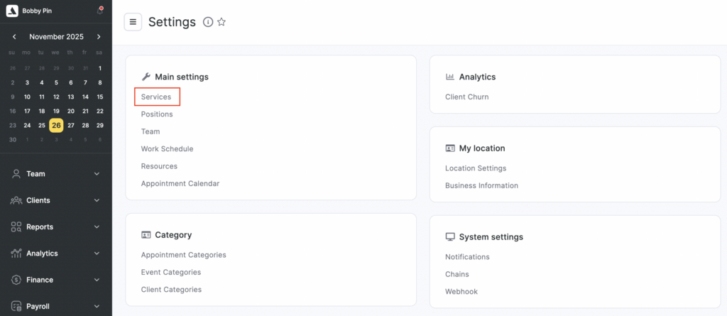 Go to “Settings” > “Main settings” > “Services”.