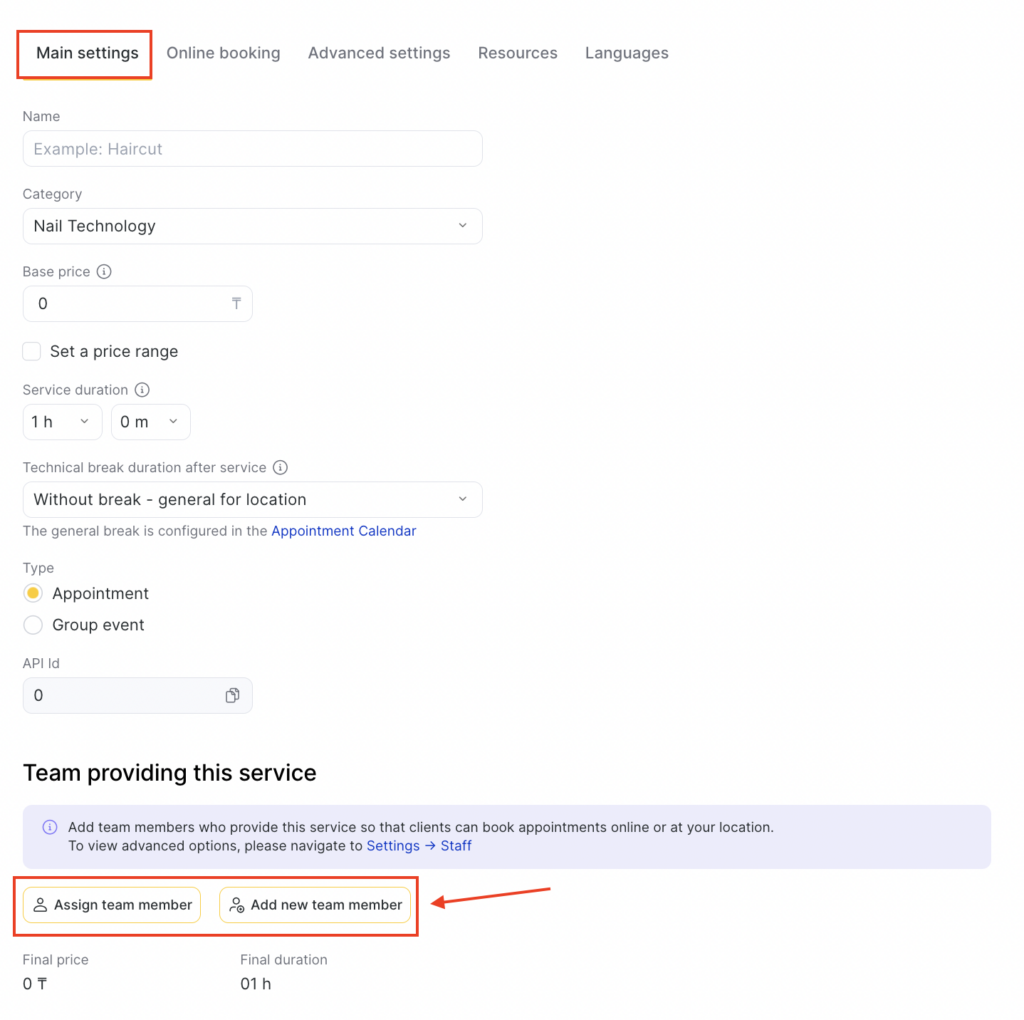 - Specify the “Service duration”. This duration will be selected by default when assigning services to employees. If necessary, you can set different durations for different employees.