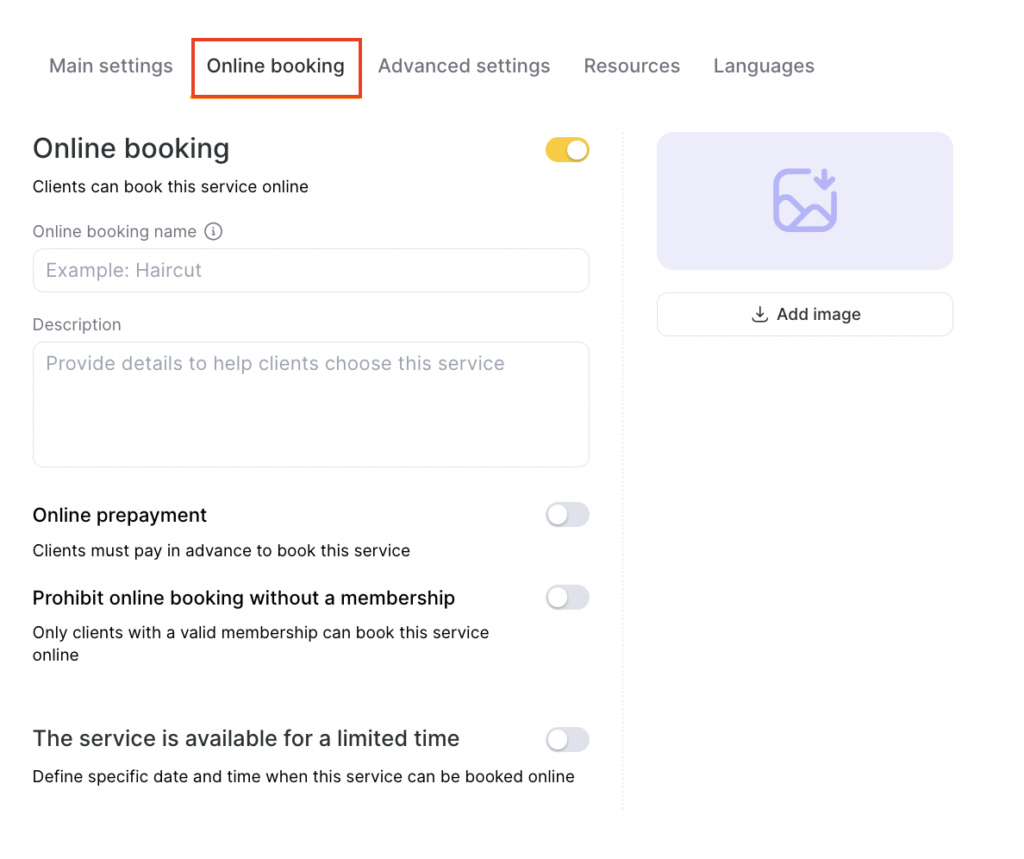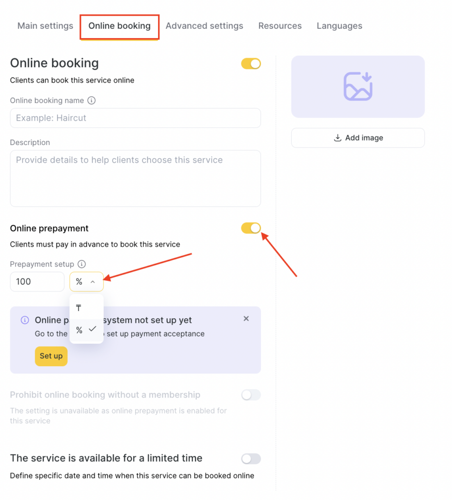 5. To enable online prepayment, switch on the corresponding toggle in the “Online prepayment” field. When online prepayment is enabled, clients will be able to pay for the service in the online booking widget.