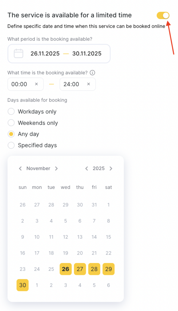 - “Days available for booking” (“Weekdays only”, “Weekends only”, “Any day”, “Selected days” — for Selected days you need to mark the required days in the calendar).