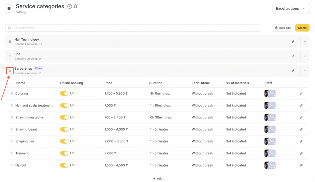 You can move services within the list inside a category. To do this, click the button with dots to the left of the service name and drag the row to the desired position. This order of services is shown both in the online booking widget and when creating a booking in the calendar.