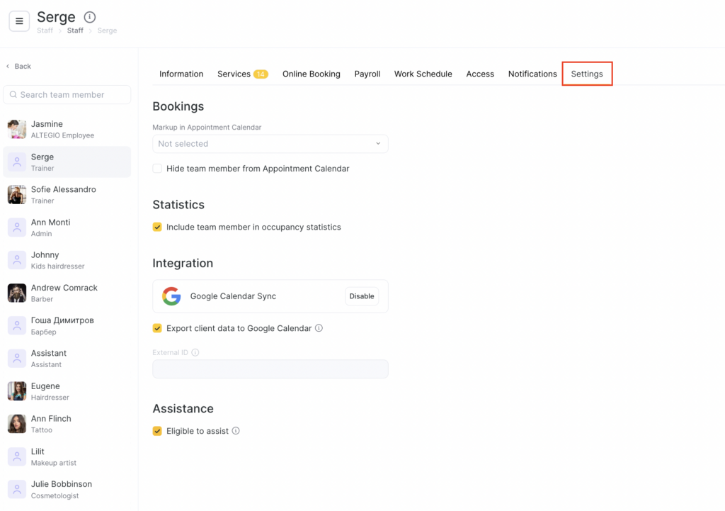 - In the Integration block, enable appointment synchronization with Google Calendar (how to connect and set it up is described here).