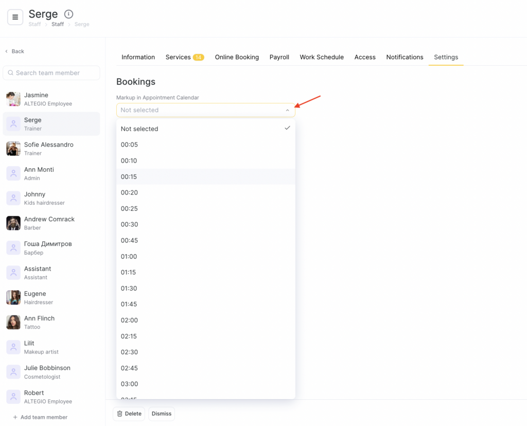 Typically, the grid in the booking journal is set based on the duration of the most popular and most profitable service, and the team member’s entire schedule is adjusted around this service so that as many appointments as possible can be created for it.