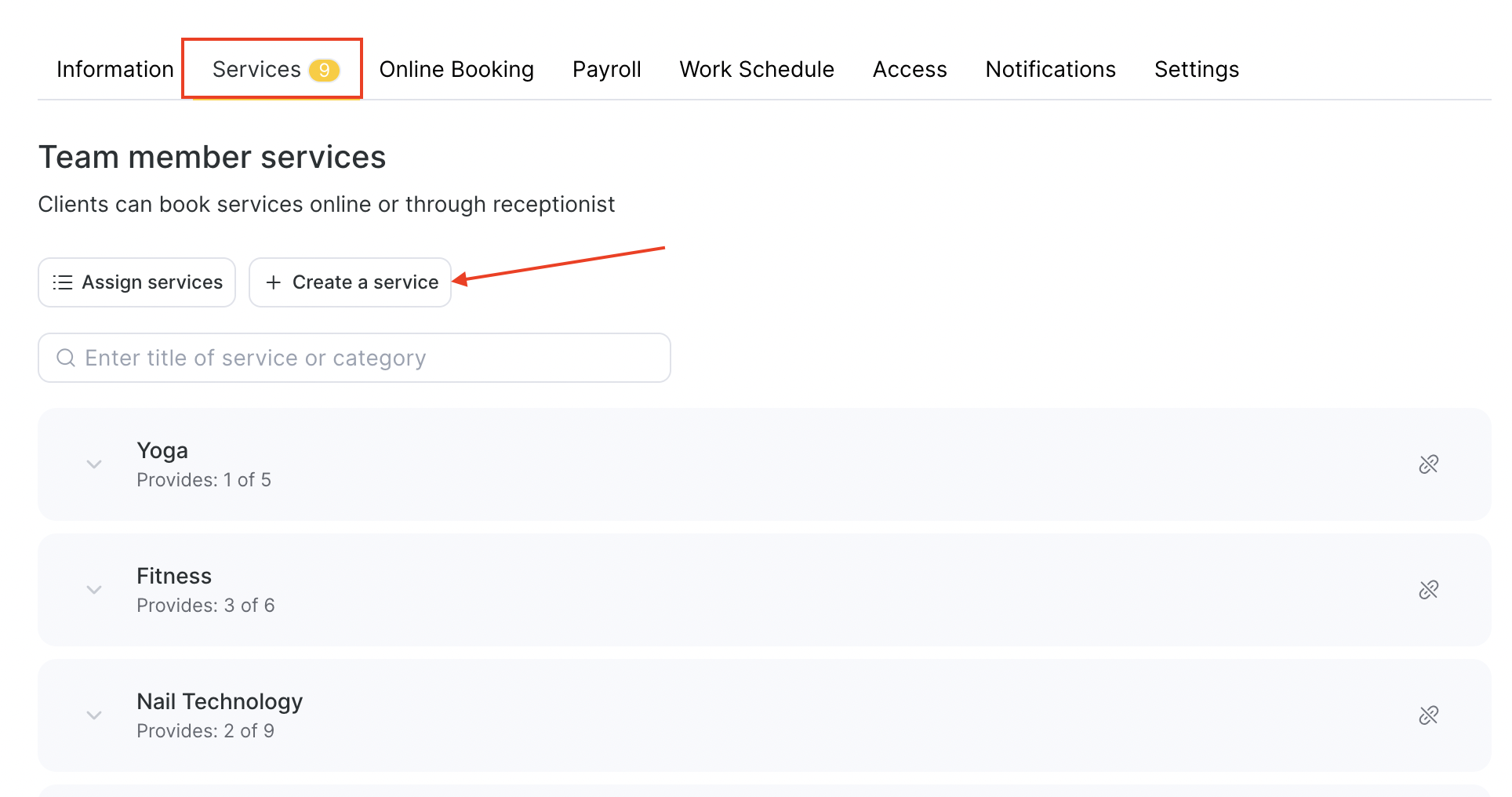 3. In the Services tab, add categories and services that the team member will provide. To do this, click the “Create a service” button.