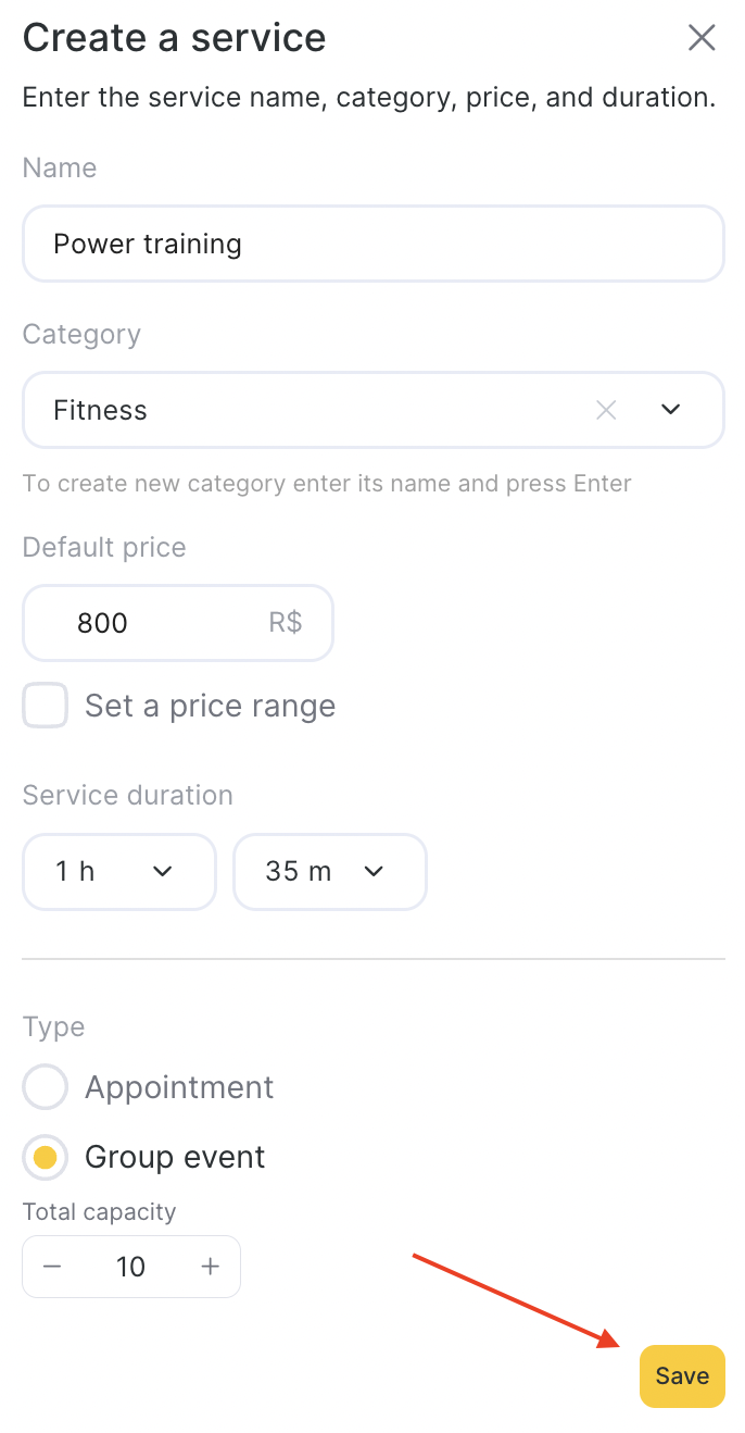 Fill in the required fields like Service, Category, Price, Duration and Booking type and click the Save button to apply your changes.