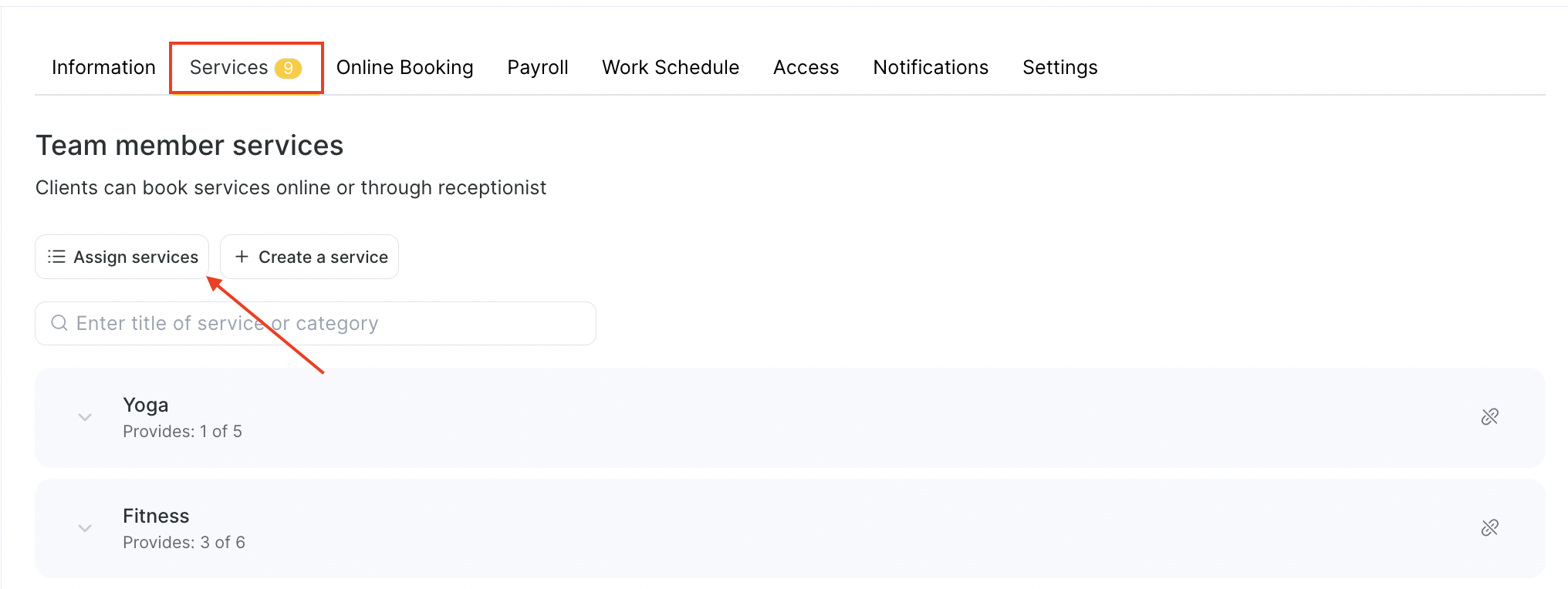 4. Additionally, you can assign services from existing categories to employees. To do so, click on the Assign services button.