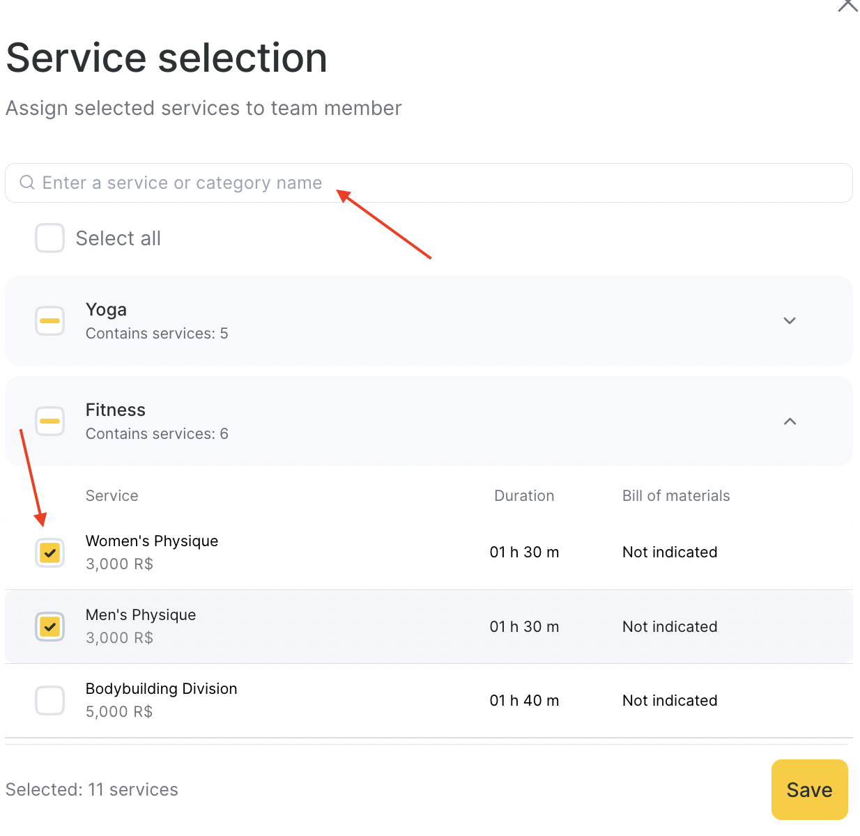 In the modal window that opens, click on the name of the category and check the box next to each service that you want to assign to the employee. You can assign all services at once by checking the topmost box.
