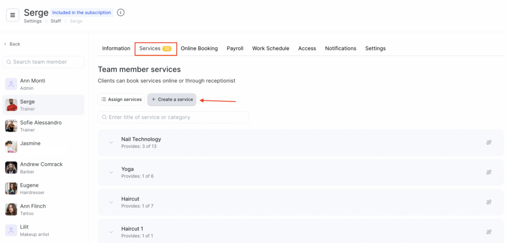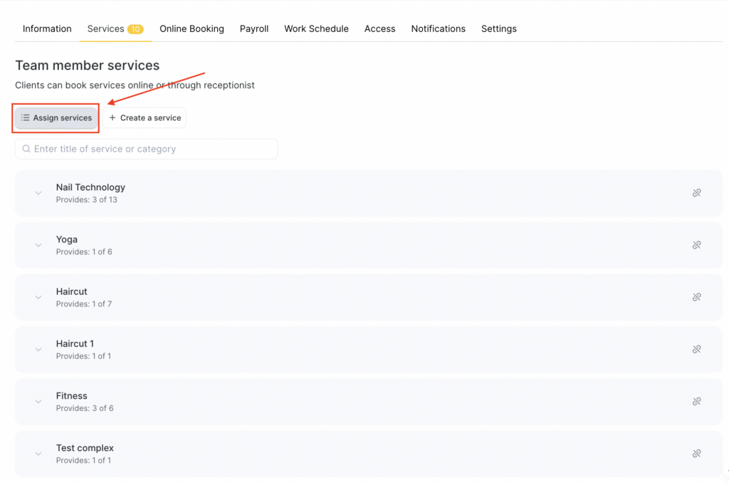 Additionally, you can assign services to team members from existing categories. To do this, click the Assign services button.