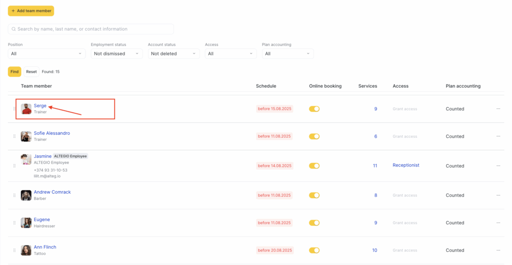 2. In the Team section of the Main settings menu. This option is ideal if you have many services and only a few team members.