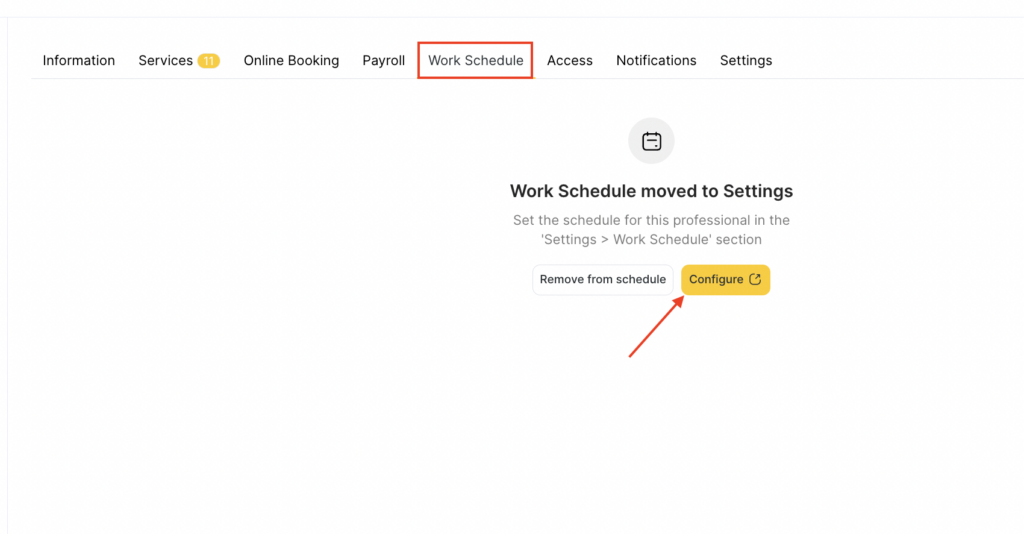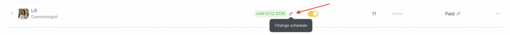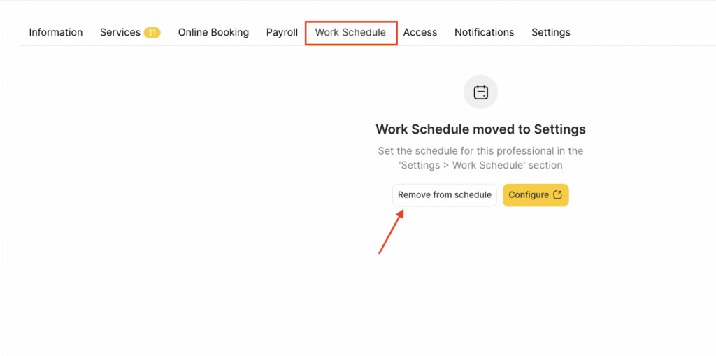 You can also delete the team member’s schedule here by clicking Remove from schedule. After you confirm the action, the team member will no longer be counted in the subscription. The current set of settings will be deleted. The team member will not be able to configure a work schedule and will also disappear from the appointment calendar and online booking.