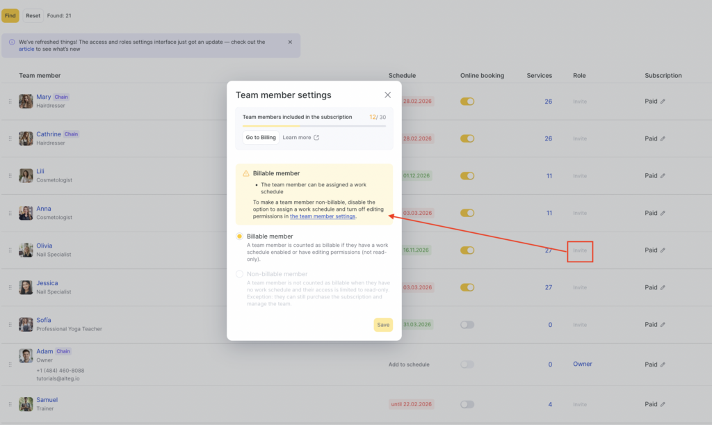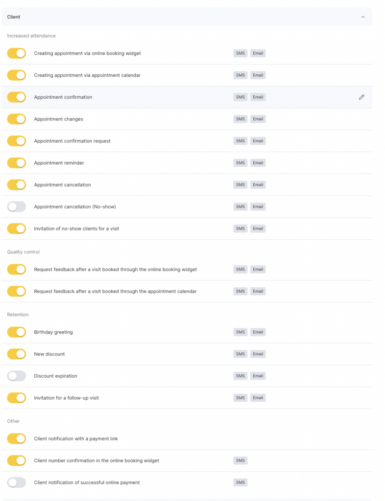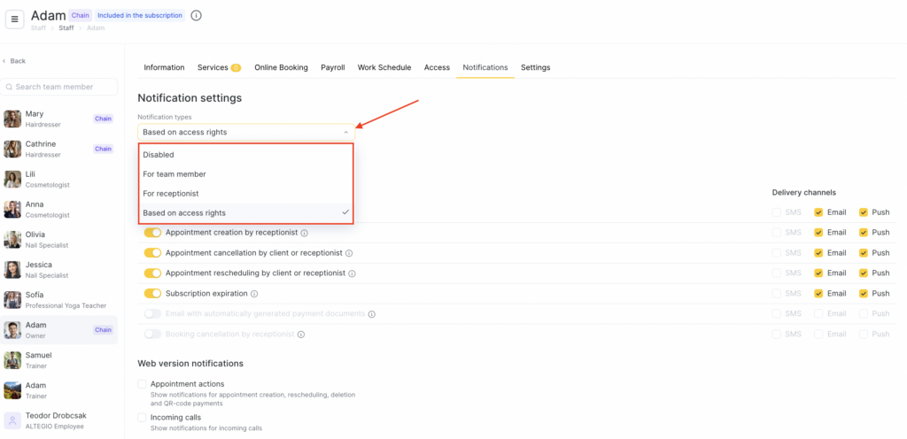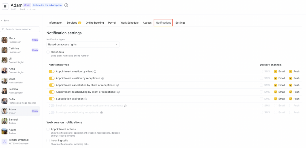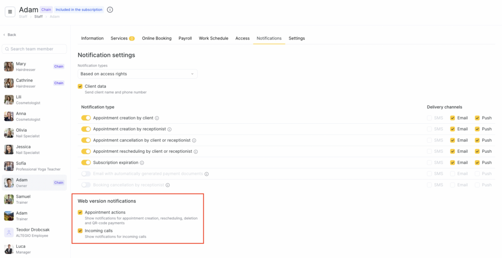 After adding all users and setting their access rights, you can configure notifications that an employee associated with a user will receive. This allows you to keep everyone informed about important events such as new bookings, cancellations, or changes to existing appointments.