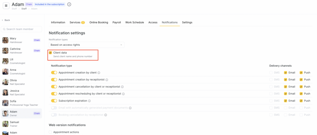 - Clients’ data. If you uncheck this box employee will not receive customer’s contact details via SMS and email notifications, however, they will receive all other booking details: time, service, etc.;