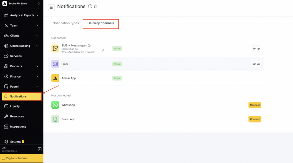 After configuring and connecting the required delivery channels, set up notification types for administrators and team member in Notifications > Notification types.