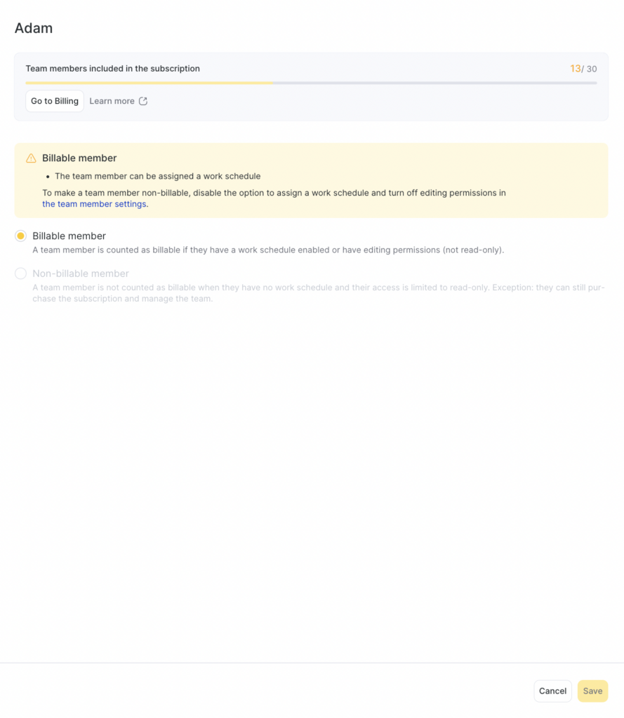 - In Team > Team members list (or Billing > Subscription > Management), click the team member’s name.