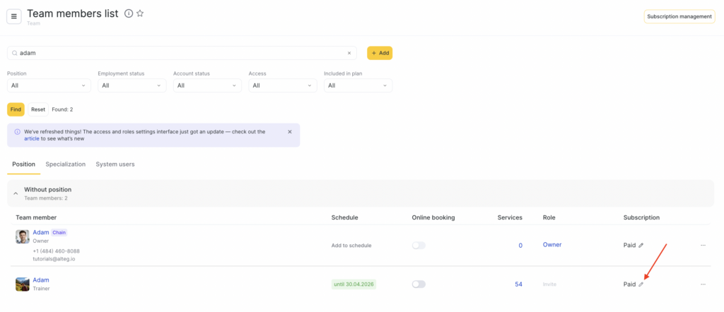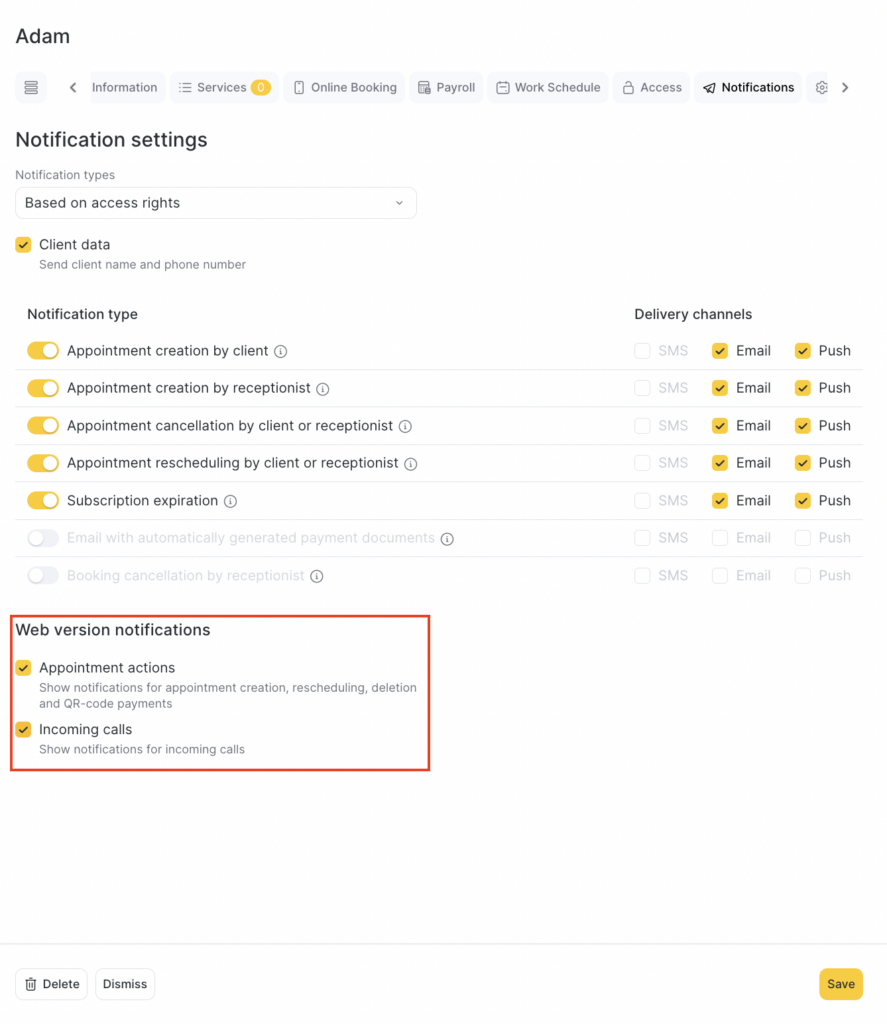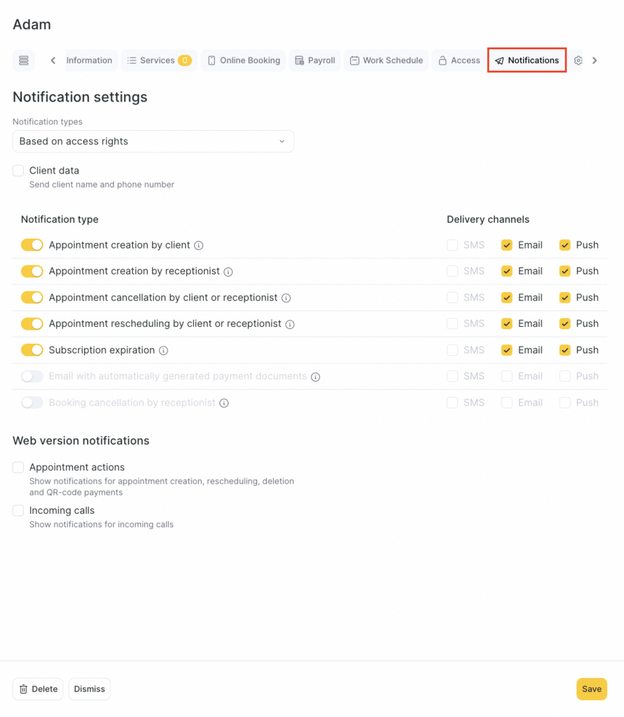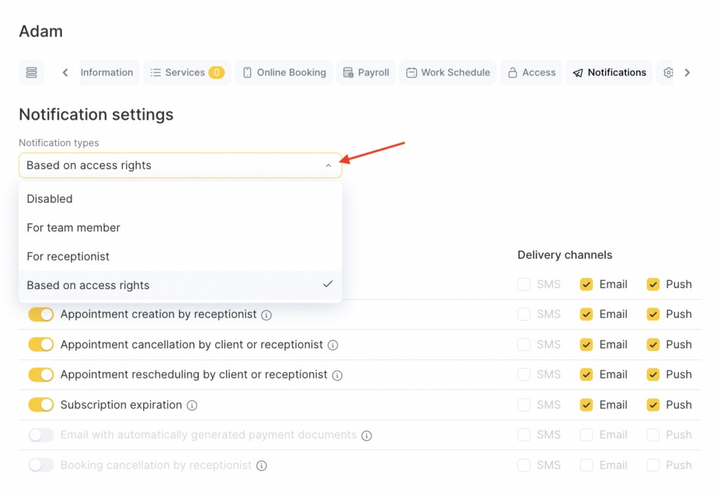 - Based on access rights — Altegio automatically determines the notification type based on the team member’s access rights.