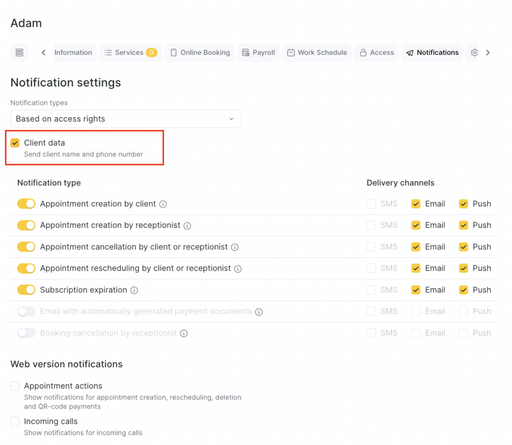 - Client data. If you uncheck “Send the client’s name and phone number”, the team member will not receive the client’s contact details in SMS, email, and push notifications, but will still receive all other appointment details (time, service, etc.).