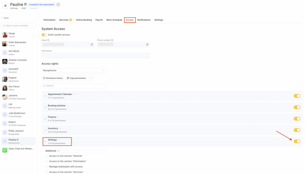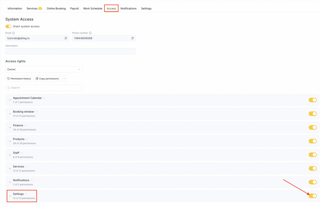 The main purpose of restricting access rights to this section is to protect Altegio from changes made without management approval that could harm the company’s image and internal business processes. This permission should be granted only to team members with extended authority (e.g., a manager or company owner).