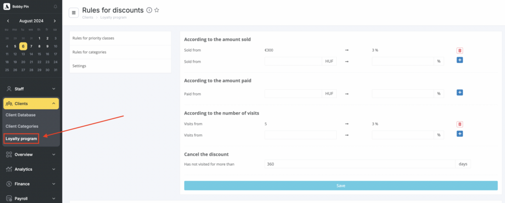 For the user to have access to this section, they need to make the right available in the “Client Database” section > access right > “Setting up loyalty programs”.