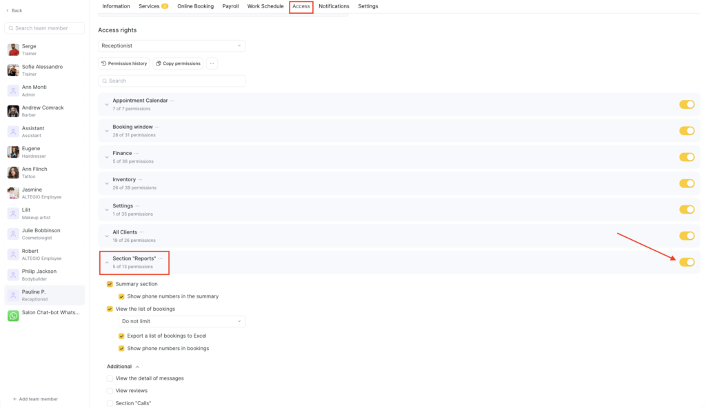 Enable this option if the team member needs to see clients’ phone numbers in Reports > Upcoming Appointments.