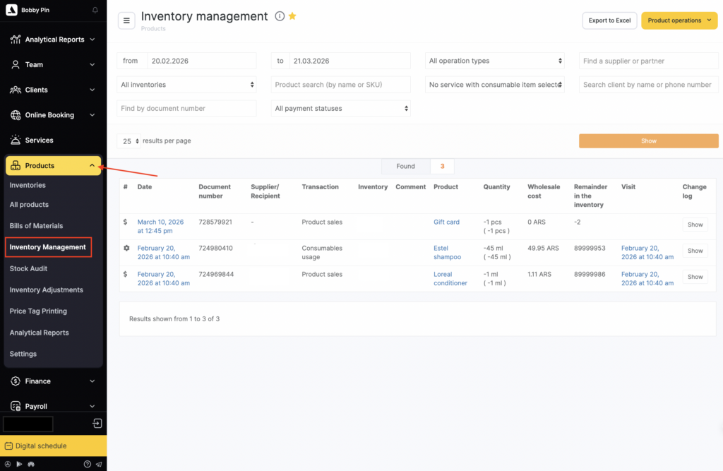 Inventory operations record any product movement: goods receipt, sale, and write-off. These operations aren’t always related to providing services to clients, so they don’t require creating an appointment in the journal.