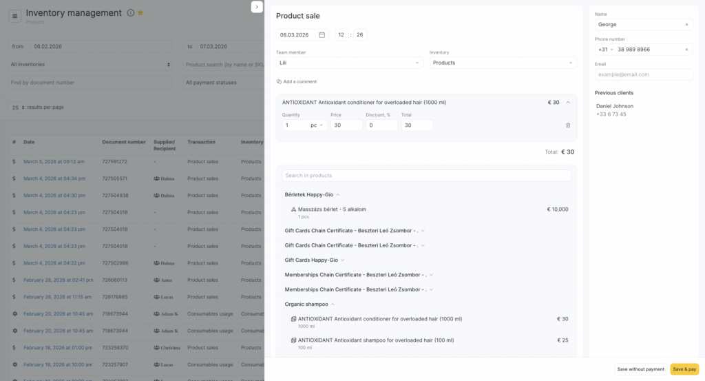 - In the window that opens, specify the date and time of the inventory operation (the current date and time will be filled in automatically). Enter and select the client’s name or phone number the product was sold to (this field is optional). Select the team member who sold the product, and the inventory (the inventory must have the For selling products type).