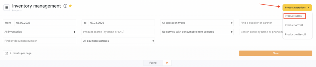 To record a product sale via an inventory operation: