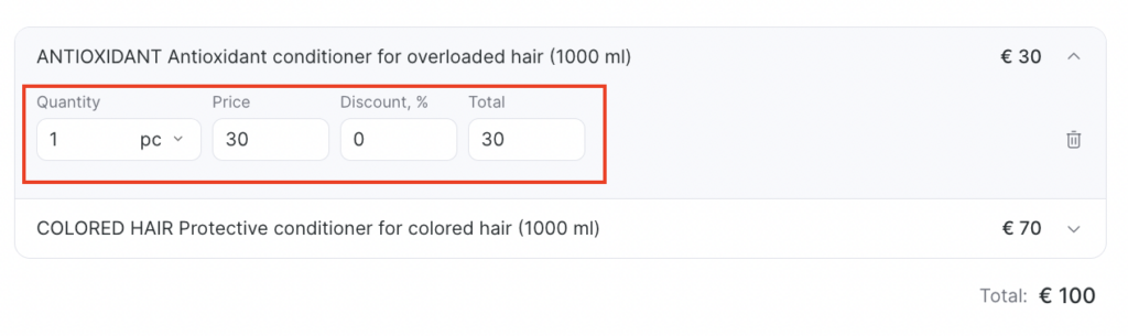 After you add products, their details will be filled in automatically. The price equals the sale price specified in the product card. If it’s set, it will be filled in automatically; if not, enter it manually.