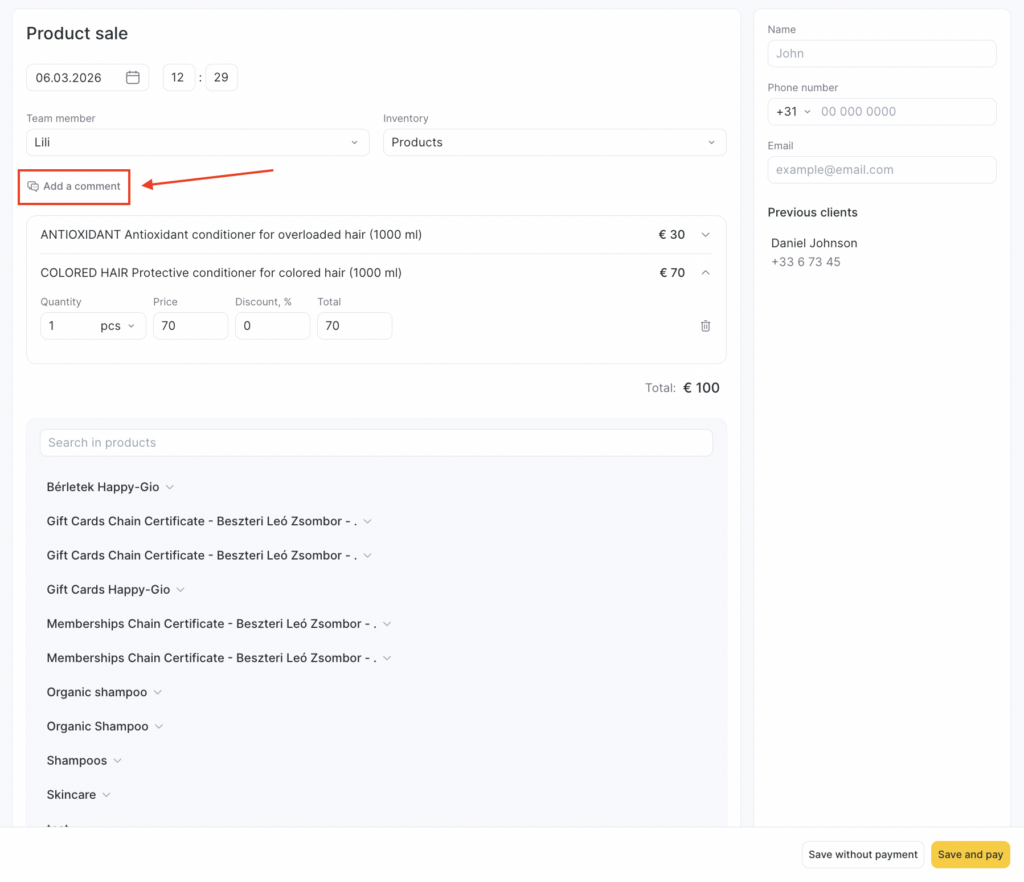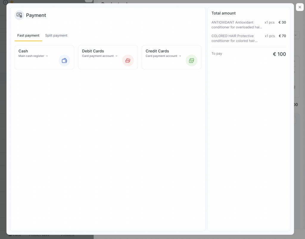 If you want to make a payment before saving, click Save and pay. You can process payment in cash, by bank card, or using loyalty.