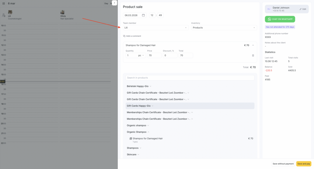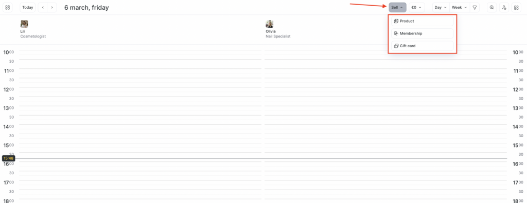 You can also use the Sell button in the same window to indicate the sale of products to clients, even if they don’t have any bookings in the Appointment Calendar for that day.